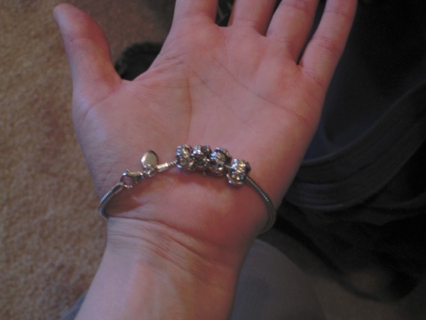 Logan got a pandora style charm bracelet for me on Elliot’s behalf. It’s sweet. It has gemstone beads for Elliot, Logan, and Me and a rocking horse bead (Elliot has a “Giant” rocking horse of the same name.) The plan is to add a bead for each major holiday or event for Elliot’s first year. I was worried I was going to get a giant booby, since that is Elliot’s favorite thing… That and fans…