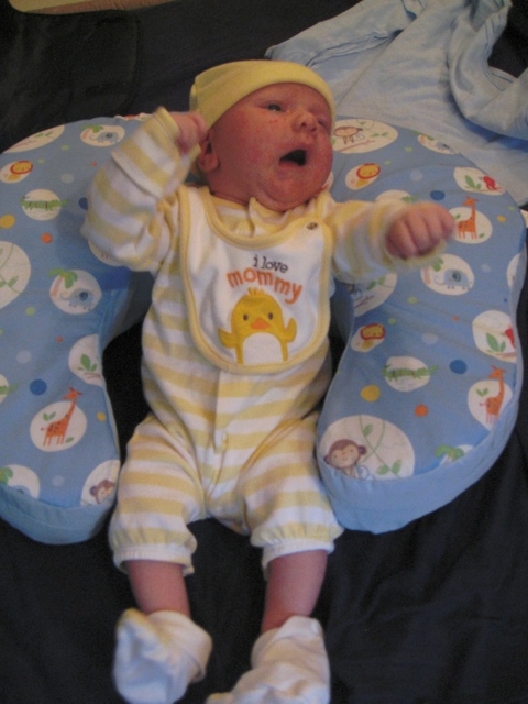 Elliot slept most of the afternoon and evening. Elliot and I went to bed at about 9. By 11, we were up again and Elliot was wide awake. Art was up so we had Elliot do a little tummy time for him and then Art sat with me while I rocked Elliot back to sleep.